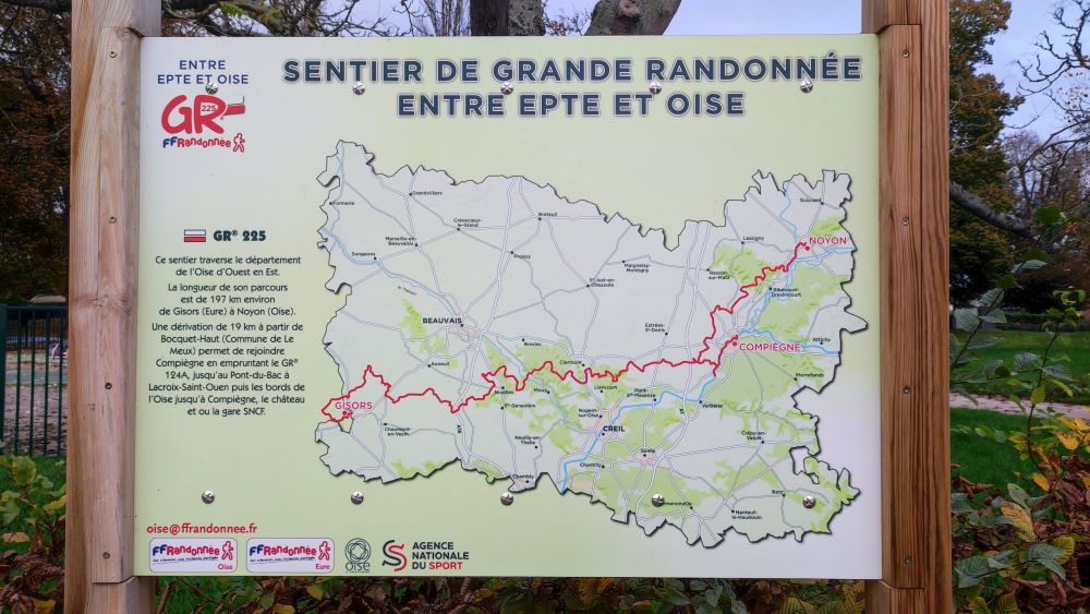 Ce GR dénommé de « L’Epte à l’Oise », qui va de Gisors à Noyon sur environ 230 km, avec une branche qui va à Compiègne (accès gare). Il traverse les plaines du Vexin, puis le plateau avant de rejoindre la vallée de l’Oise et la forêt de Compiègne. Les points de départ sont les gares de Gisors, Noyon et Compiègne.