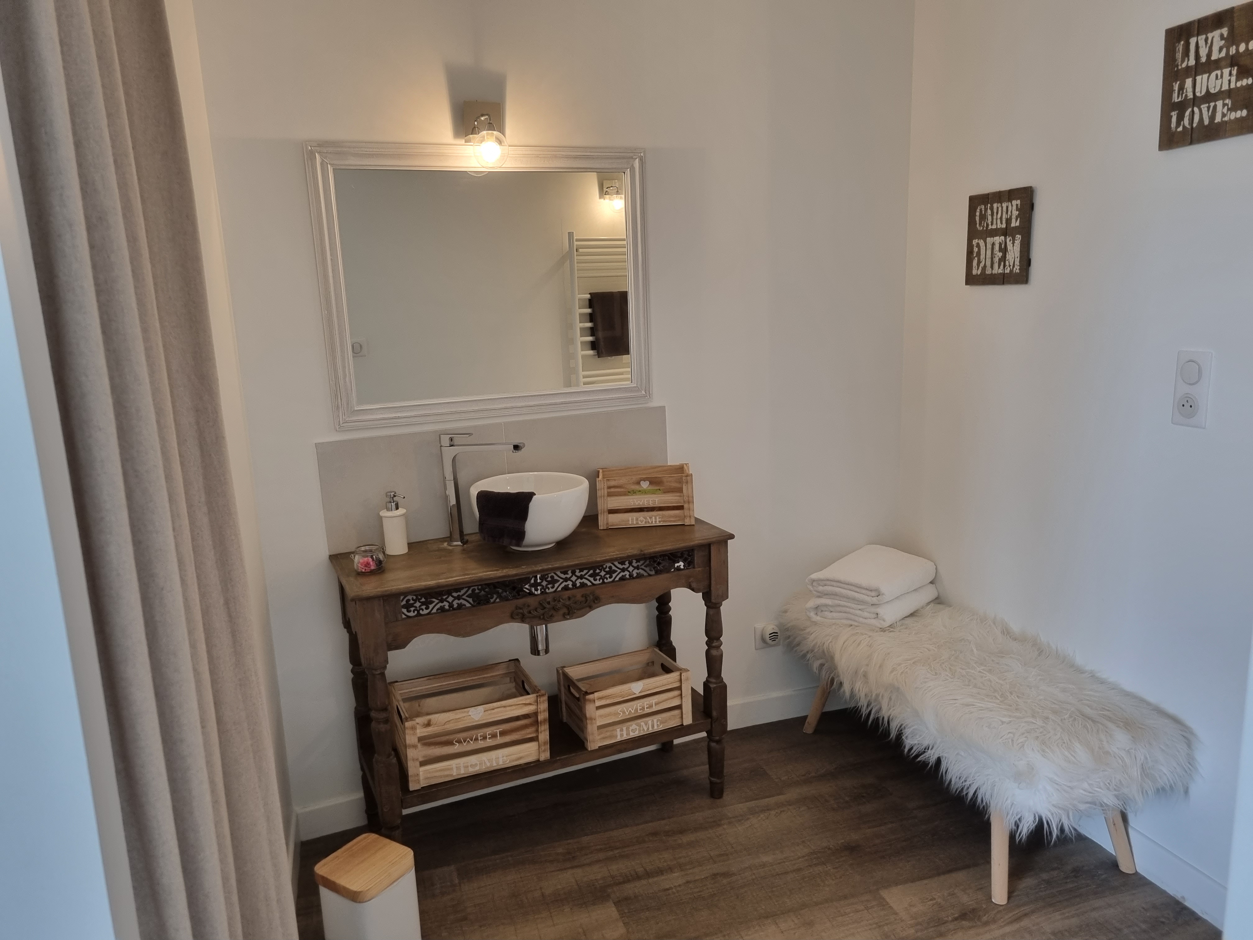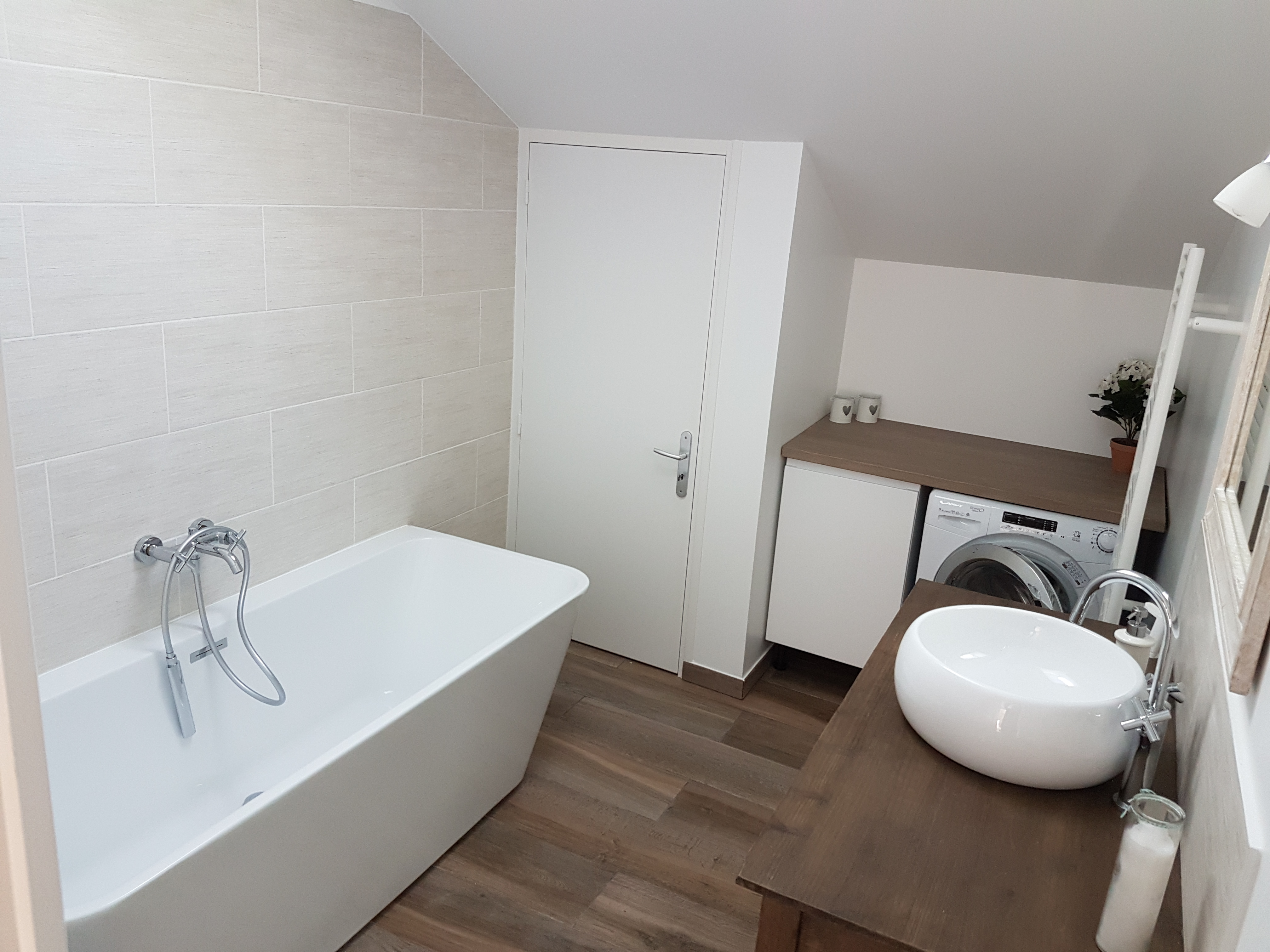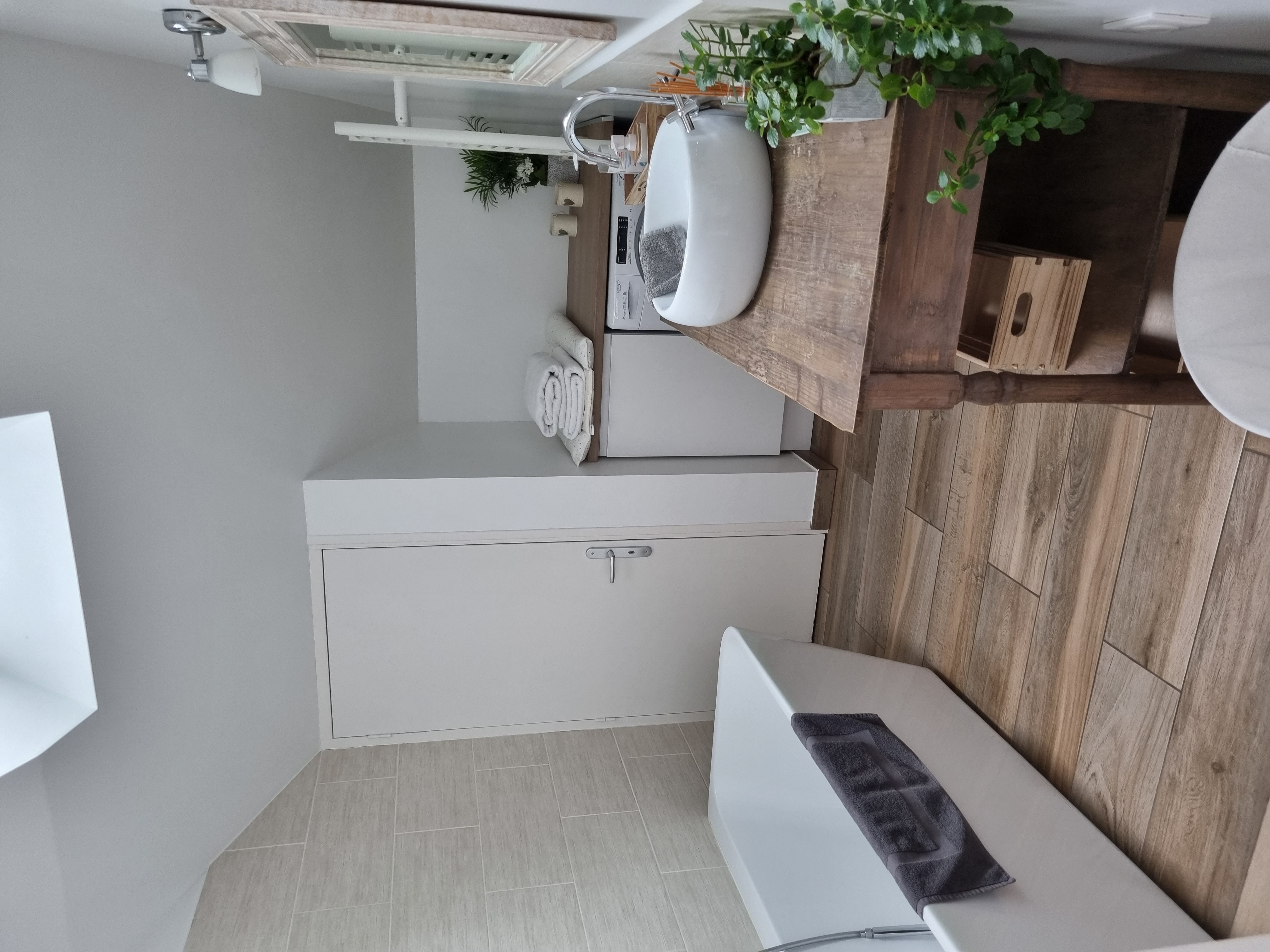 Vous disposez de toilettes séparées et d’une salle de bains avec baignoire et d’une machine à laver lavante/séchante.