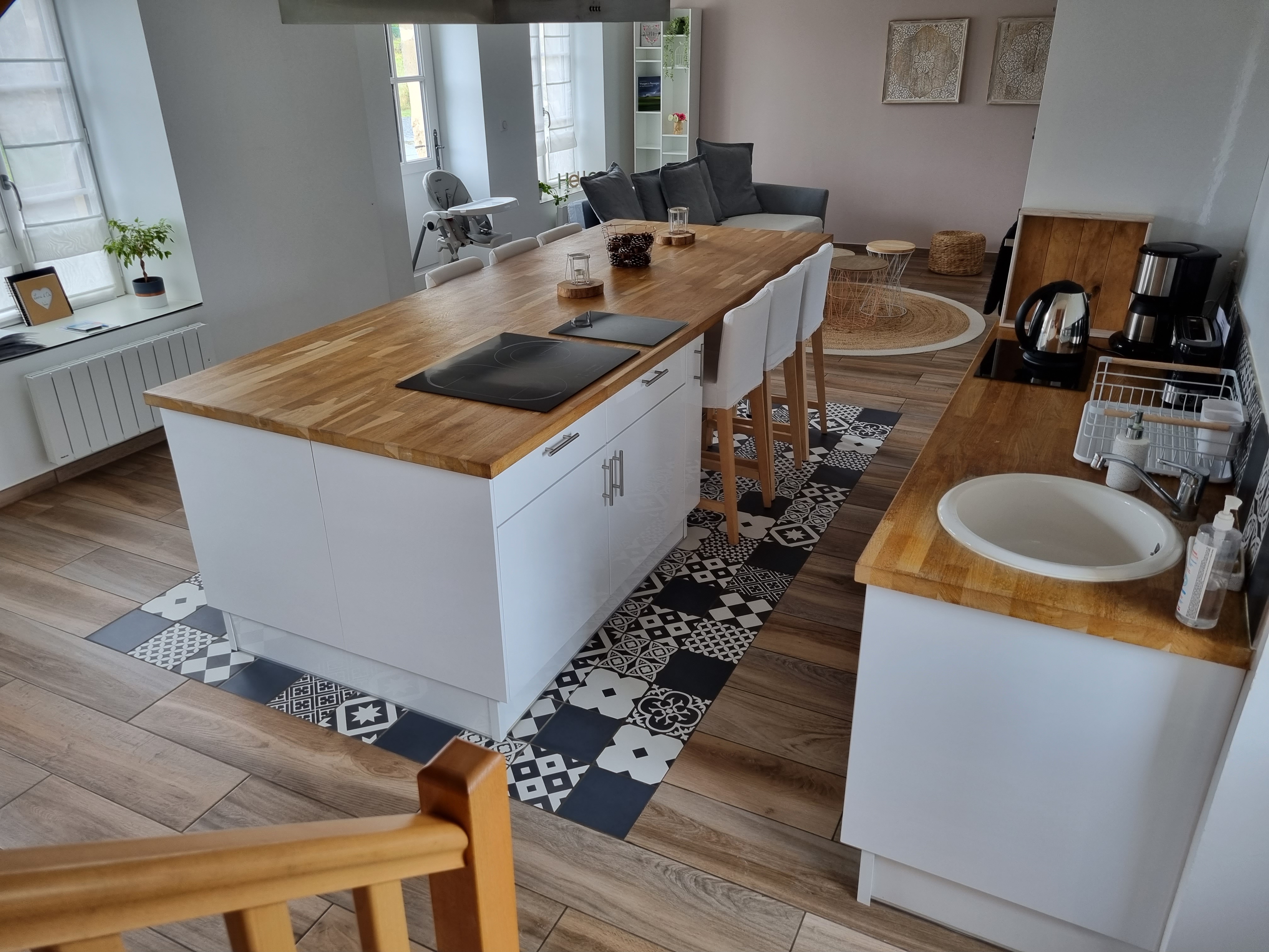Au rez-de-chaussée, la porte d’entrée s’ouvre sur une grande pièce à vivre de 45 mètres carrés qui comprend une grande cuisine équipée avec de l’électroménager neuf: un four, un micro-ondes, une plaque à induction avec hotte aspirante, un combiné réfrigérateur/congélateur, un lave-vaisselle, une cafetière et une bouilloire. Tous les ustensiles de cuisine et la vaisselle sont à votre disposition.L’espace repas peut accueillir 6 personnes à table, autour du grand îlot en chêne massif.