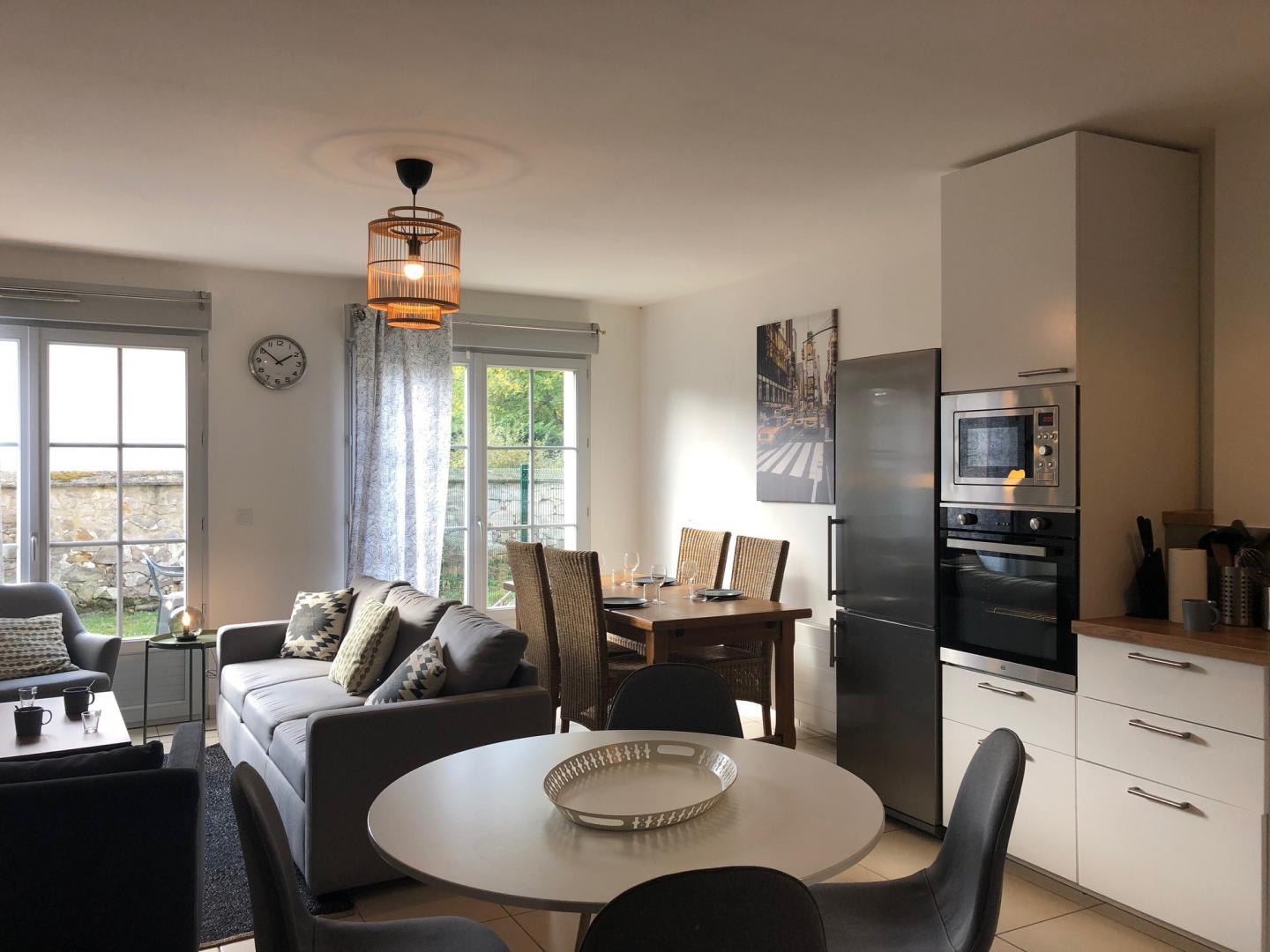 Ce gite de 88 m² rénové avec goût peut accueillir jusque 6 personnes. Il est aménagé sur 3 niveaux, dispose de 4 chambres, 2 salles de bains et 2 wc. Au rez-de-chaussée, il est composé d'un grand séjour/salon avec TV, ouvert sur une cuisine équipée (micro-ondes - four - réfrigérateur - lave vaisselle - lave linge et sèche linge, cafetière, bouilloire....), d'une salle d'eau (douche), lave -mains et Wc. Au 1er étage : 2 chambres pour 2 personnes (2 lits 90x200 cm) chacune - Une salle de bain (baignoire), vasque, Wc. 2ème étage (sous comble) : 2 chambres pour 1 personne chacune (1 lit 120x190 cm + 1 lit 90x200 cm). Connexion internet en Wifi. Jardin, terrasse, salon de jardin, barbecue. Pour votre confort, le linge de maison, les serviettes de toilette, les draps sont compris dans la prestation. Un relevé de compteur sera effectué pour le règlement des charges électriques. Le forfait ménage en fin de séjour de 120 € est à ajouter au prix du séjour